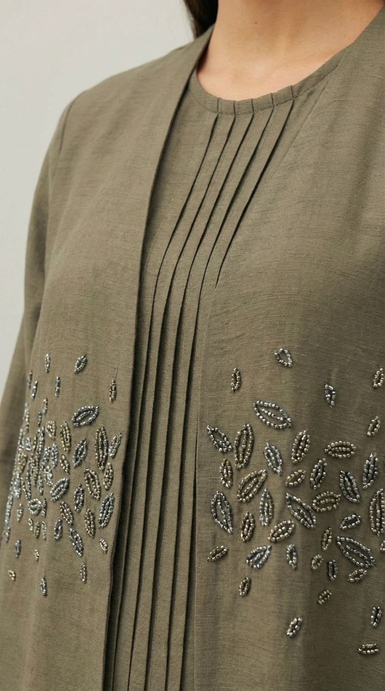 The Emirah Dubai Crystal Leaf Abaya is a refined blend of elegance and modern modesty. Designed in a rich, earthy tone, this abaya features delicate crystal leaf embroidery that flows beautifully along the torso and sleeves. The design feels graceful yet understated, making it easy to wear for both special occasions and elevated everyday moments. Its clean silhouette and soft drape create a polished look without feeling heavy or overdone.
